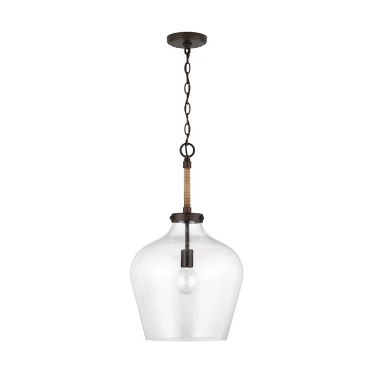 This single pendant light has a breezy silhouette with seeded glass and rope accents to create a coastal farmhouse look above your kitchen island or dining table. It has a seeded glass bell shade that complements the metallic finish and rope-wrapped down rod. A single 100w bulb (not included) washes your space in just the right amount of glow. This fixture is compatible with a dimmer switch to effortlessly take you from morning to night. Plus, it hangs from an adjustable chain and has a sloped ceiling-compatible canopy.